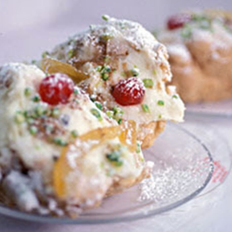 and covered with granulated almond, orange peel, candied cherry and powdered sugar.